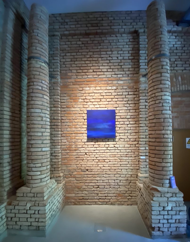 (1) Blue Deep – 100*120 cm, (2) Blue Globe ø40cm, (3) Dark Blue sand ø60cm, (4) Spheric Blue ø40cm – alle Mischtechnik auf Leinwand