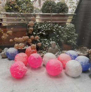 Schon im Vorgarten laden Strandbälle mit Farbpigmenten nicht nur zur Betrachtung, sondern ausdrücklich auch zur spielerischen Interaktion ein, sofern die Temperaturen es erlauben.