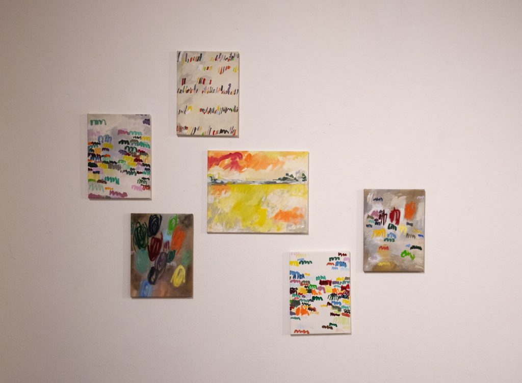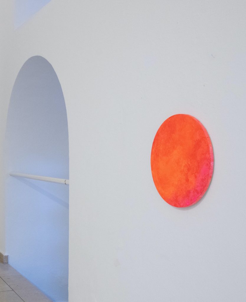 (5) Comtesa – 100*120 cm, Acryl auf Leinwand, (6) Pink Planet II ø60cm, (7) Shiny Orange ø40cm, (8) Orange Flame ø40cm (9) Mini-Venurs ø30cm – Alle Mischtechnik auf Leinwand.